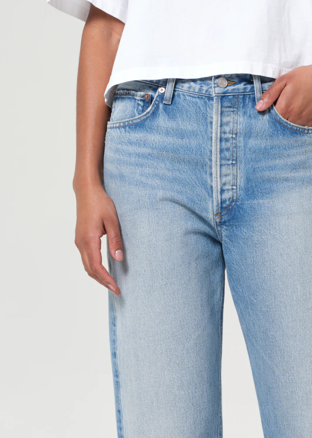 Nostalgie pur! Dieser 90er-Jahre-inspirierte Schnitt aus marmoriertem Vintage-Indigo-Denim und regenerativer Baumwolle bietet eine entspannte mittlere Leibhöhe, einen lockeren Schnitt an der Hüfte und ein lockeres, gerades Bein. Kombinieren Sie ihn mit einem schlichten, taillierten Tanktop und minimalistischen Sandalen für einen lässigen Look oder peppen Sie ihn mit einer eingesteckten Seidenbluse und Loafern für einen eleganten, edlen Look auf.