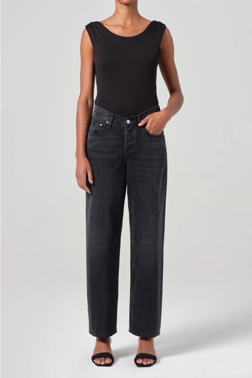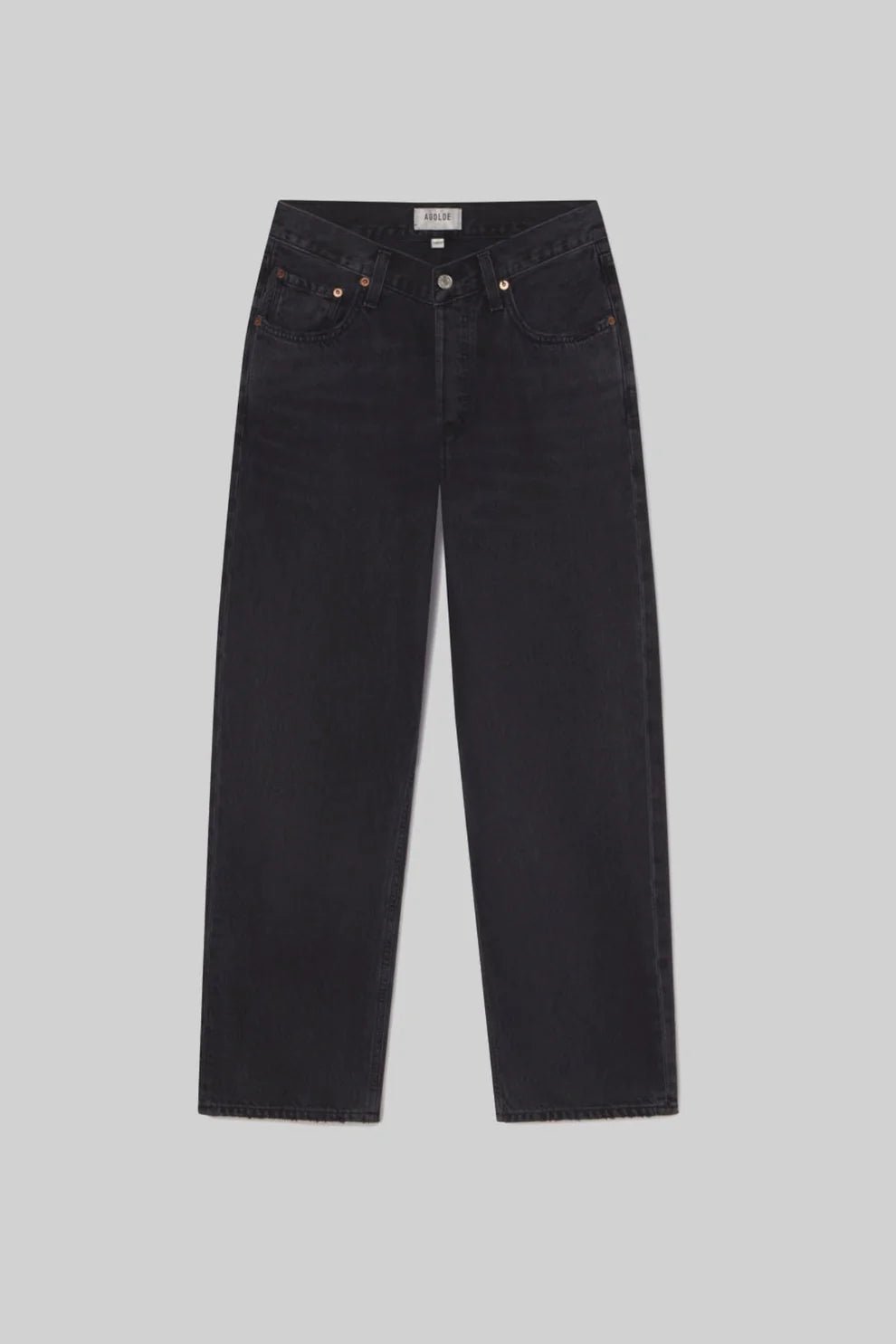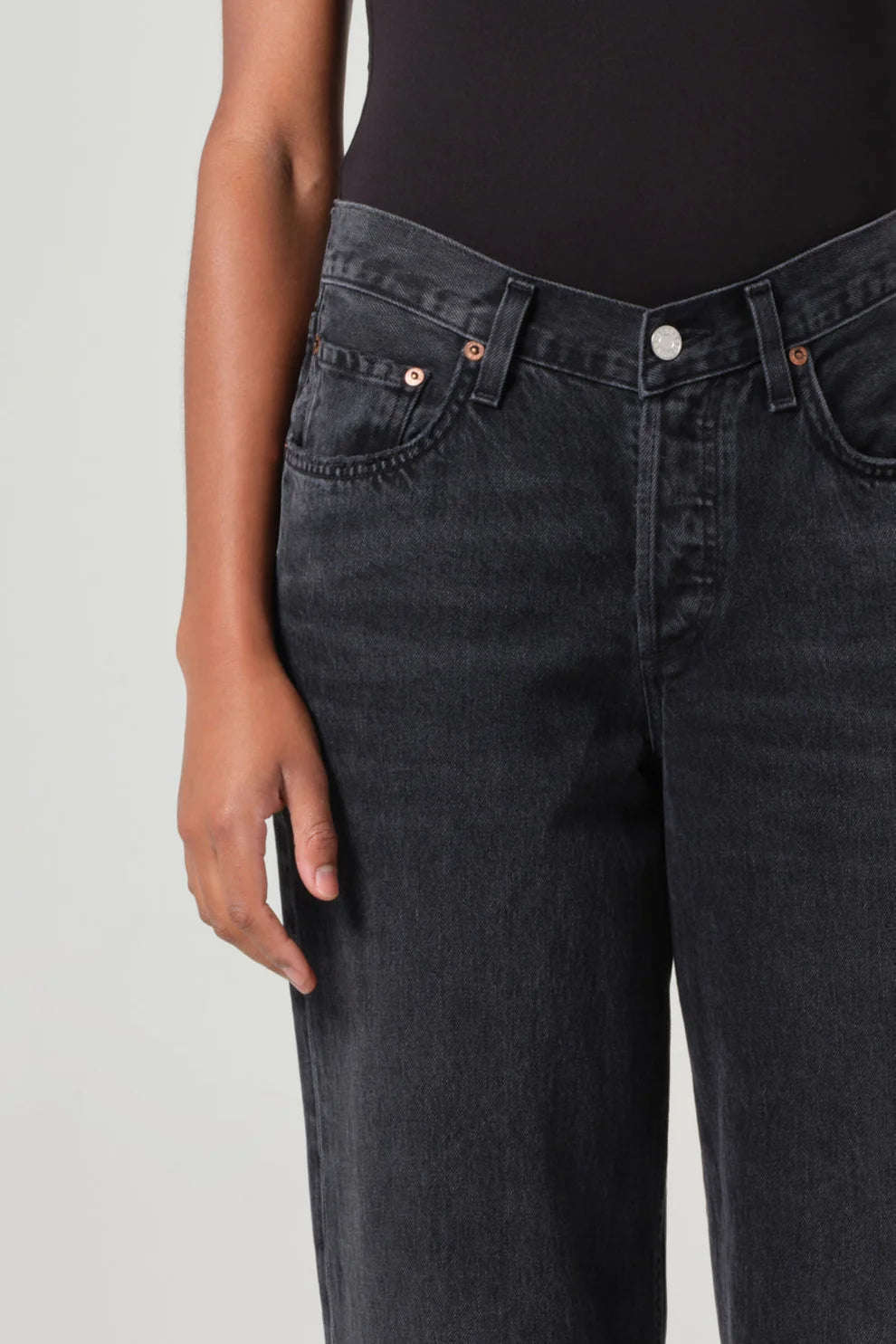 Sieht aus wie: Vintage-Medium-Indigo-Denim mit V-förmiger Bundhöhe