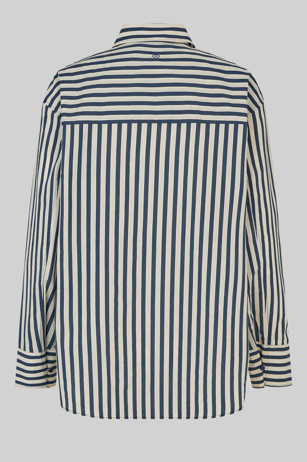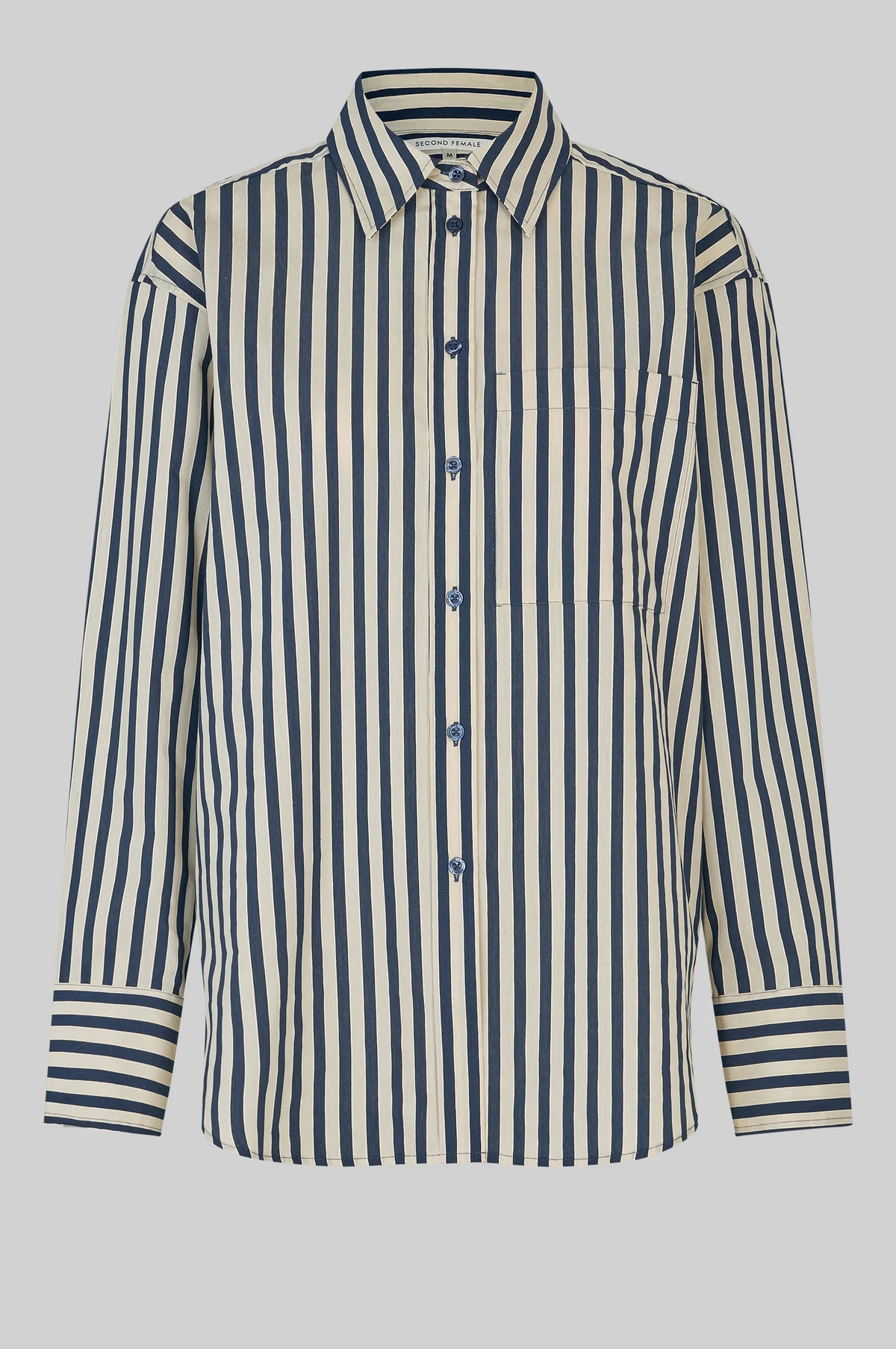 Gestreiftes Hemd von Second Female. Das Hemd ist aus einer leichten, glatten Baumwollmischung mit durchgehenden Streifen gefertigt. Mit normalem Kragen, durchgehender Knopfleiste vorne und Knöpfen an den Seiten. Lange Ärmel mit geknöpften Manschetten. Geformter Saum. Lockere Passform.