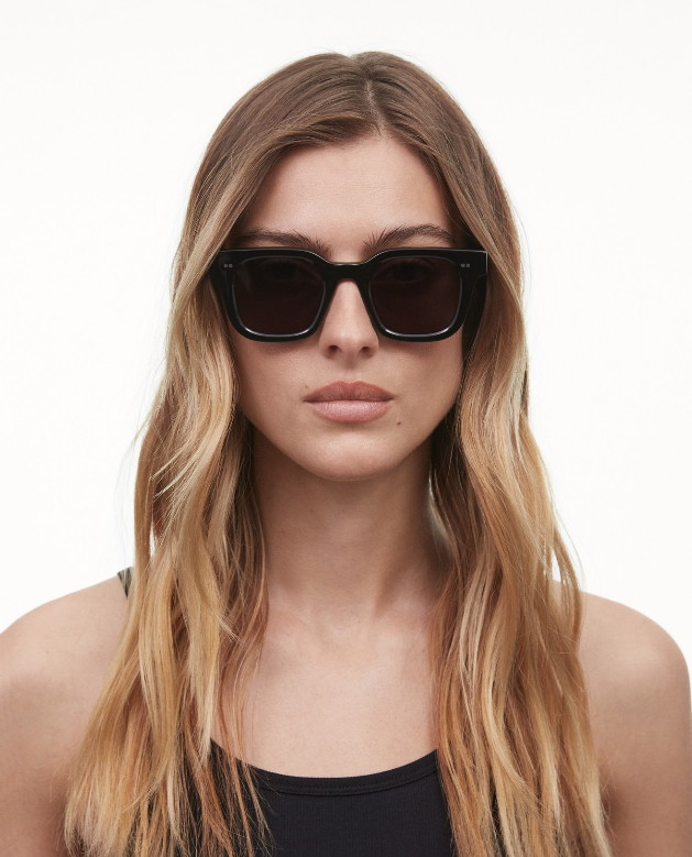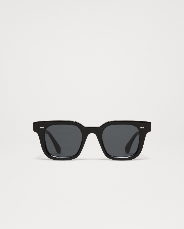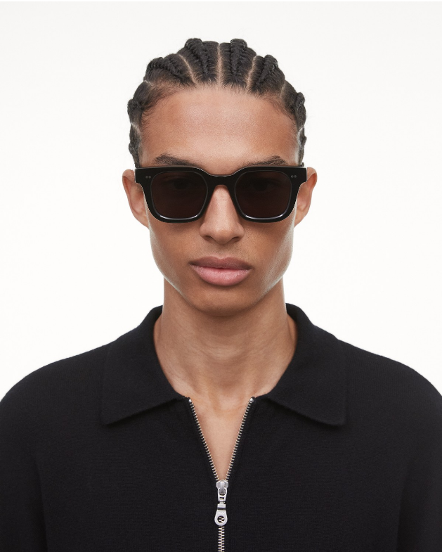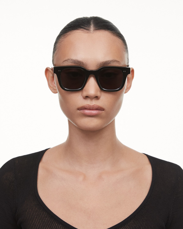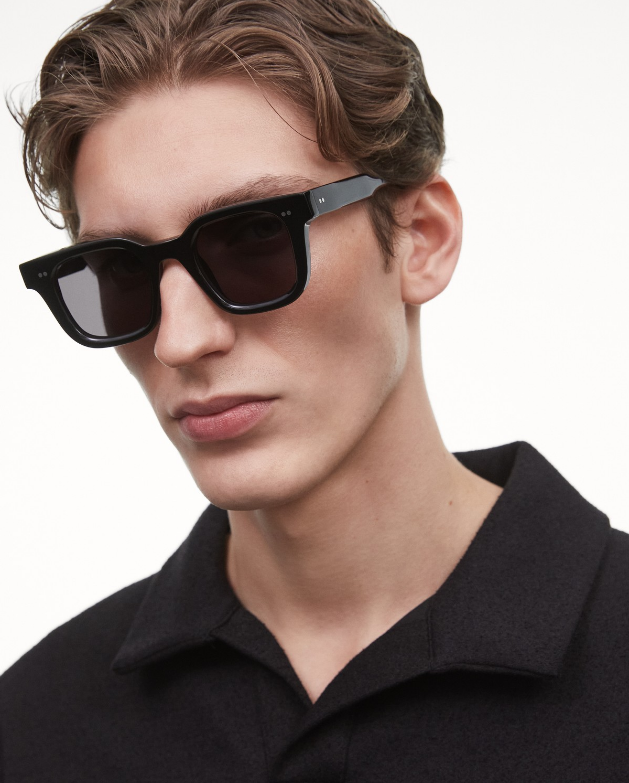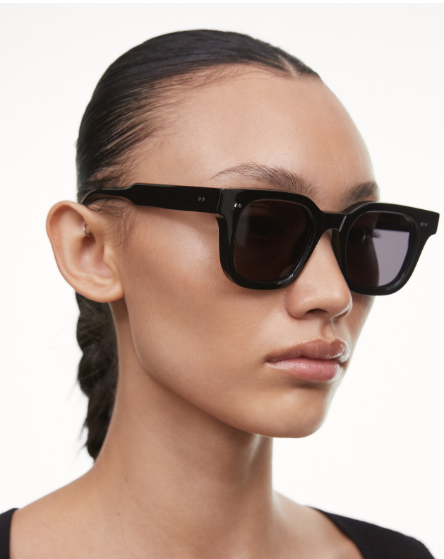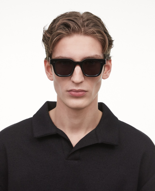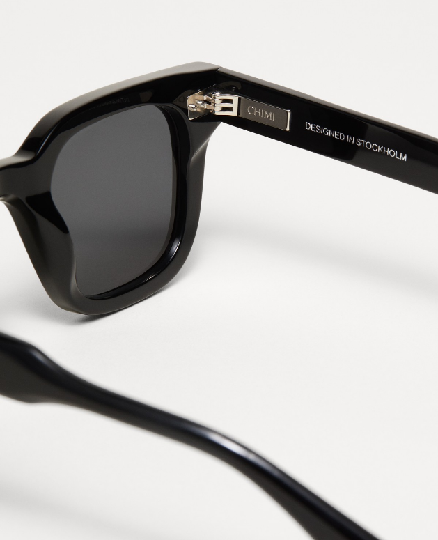 CHIMI Sonnenbrille 04 ist eine stilistische Silhouette, die mit einem starken rechteckigen Rahmen und schlanken Seiten einen dynamischen Kontrast schafft. Abgerundet mit silberfarbenen Nietenscharnieren und tiefen Schrägschnitten entlang der UV-schützenden, flachen CR39-Gläser.