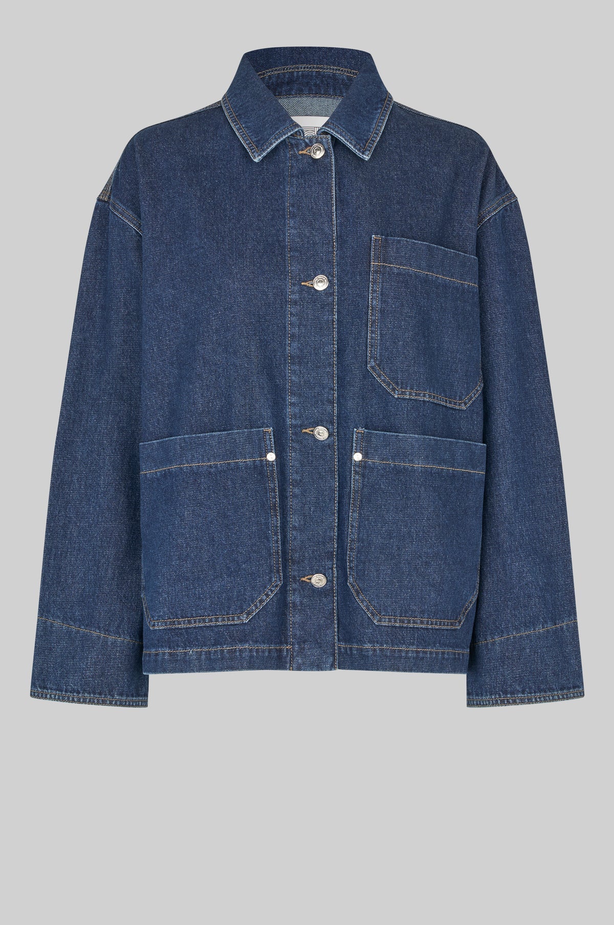 Second Female Jeansjacke in Dunkelblau. Die Jacke ist aus Baumwoll-Denim gefertigt und besticht durch eine dunkelblaue Waschung und Kontrastnähte. Sie verfügt über einen klassischen Kragen und eine Metallknopfleiste. Drei aufgesetzte Taschen befinden sich vorne. Marken-Hardware in Silber. Lockerer, gerader Schnitt.