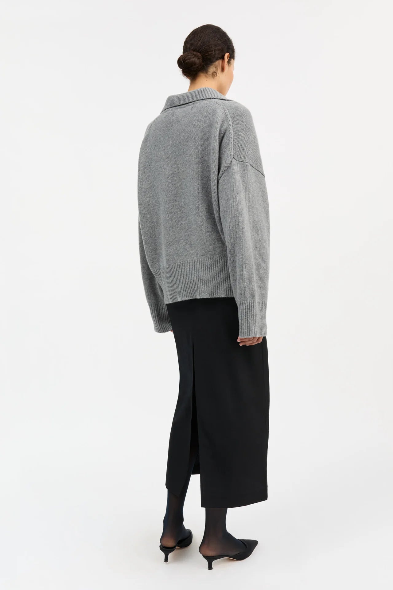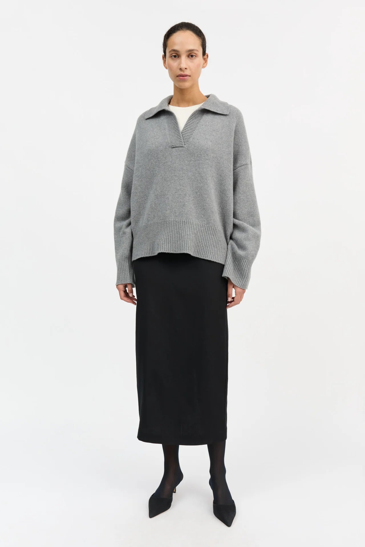 Der Dean V-Ausschnitt-Pullover ist ein legerer Strickpullover aus 100 % Merinowolle mit überkreuztem V-Ausschnitt, der in einen breiten Rippkragen übergeht. Die weiten Ärmel mit überschnittenen Schultern sind ebenso wie der Rumpf mit einem tiefen Rippbündchen versehen.