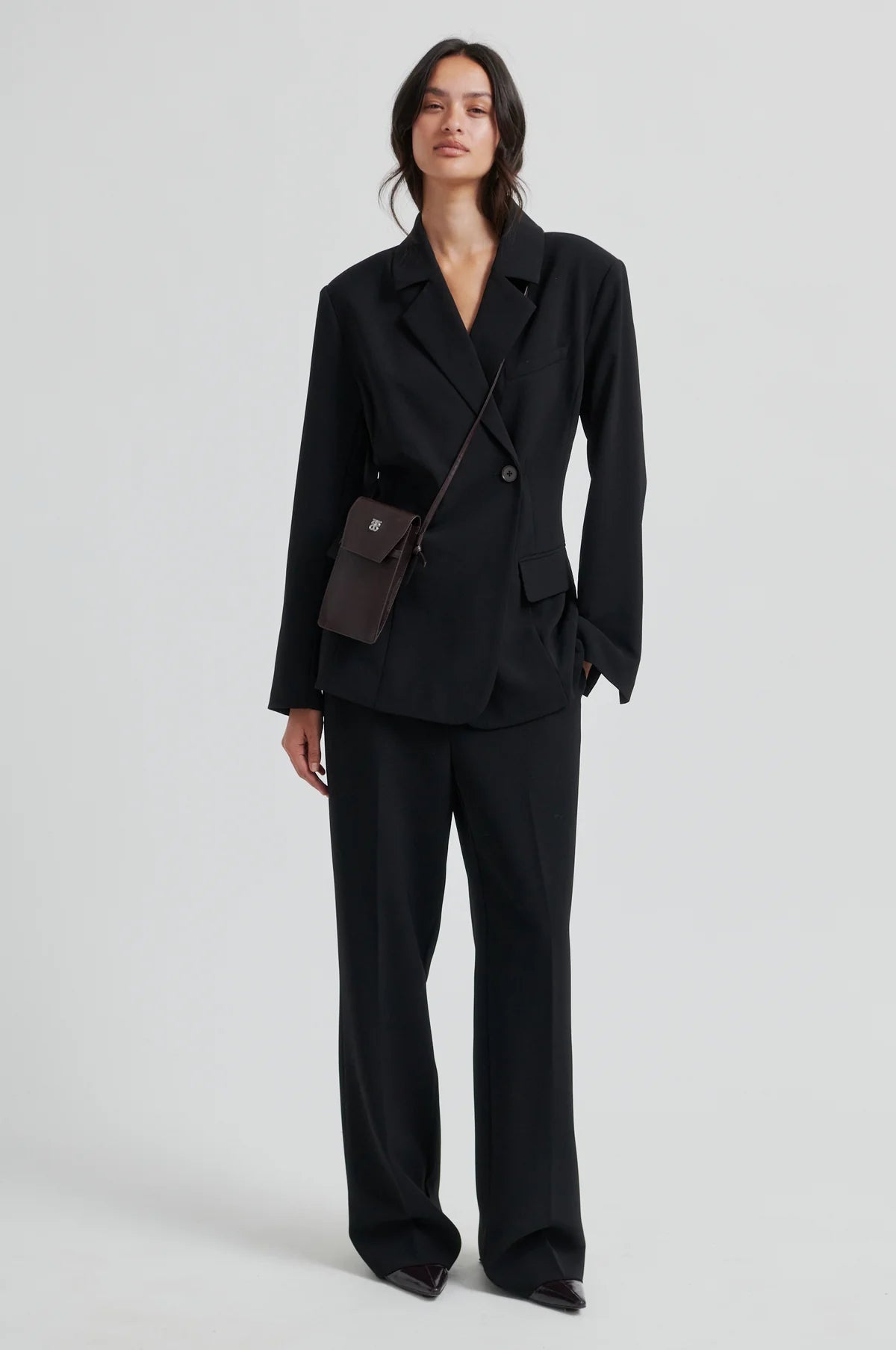 Zweiter Damenblazer mit Gürtel. Der Blazer ist aus leichtem, fließendem Stoff gefertigt. Er verfügt über ein fallendes Revers und einen Knopfverschluss. Gepolsterte Schultern und Ärmel mit Schlitzen. Zwei Pattentaschen und eine dekorative Brusttasche. Komplett gefüttert. Schmale, taillierte Passform.