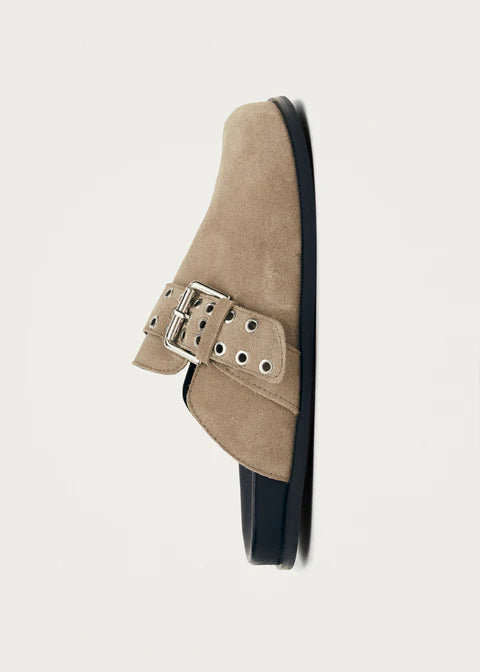 Wer hätte gedacht, dass ein Clog so viel Attitüde haben kann? Die Halia Pantoletten sind aus weichem Wildleder gefertigt und verfügen über dicke, mit Ösen verzierte Riemen mit robusten Schnallen. Mit weichen Lederfußbetten gehört Komfort zum Standard, egal ob du sie draußen oder zu Hause trägst.
