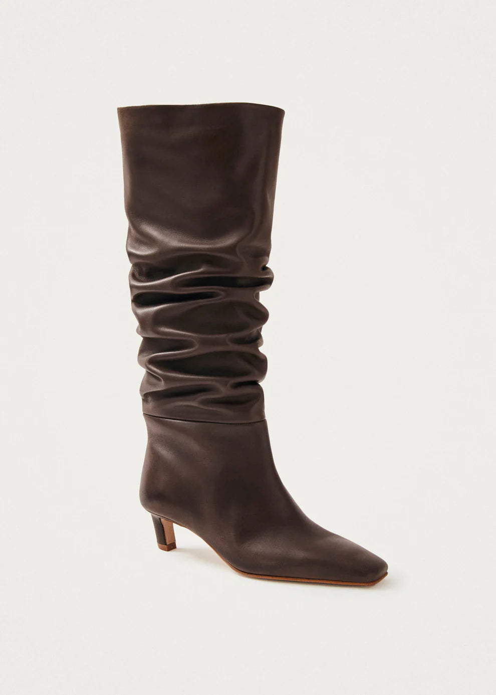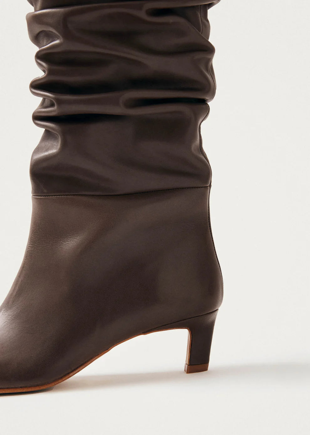 Ein Wort: Attitüde. Die Kalila sind über dem Knie Stiefel aus schwarzem Leder gefertigt, mit verlängerten eckigen Zehen und feinen Kitten Heels, die den ganzen Tag über Komfort bieten. Ihr dramatischer faltiger Effekt an den Schaften verleiht ihnen einen auffälligen Flair, der in jedem Look im Mittelpunkt stehen wird.