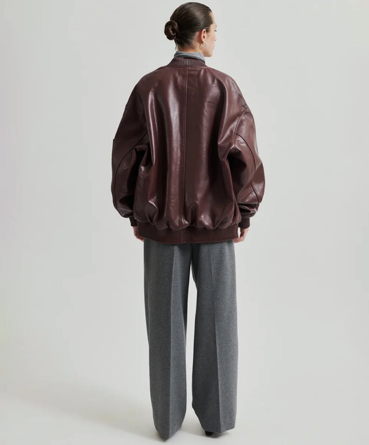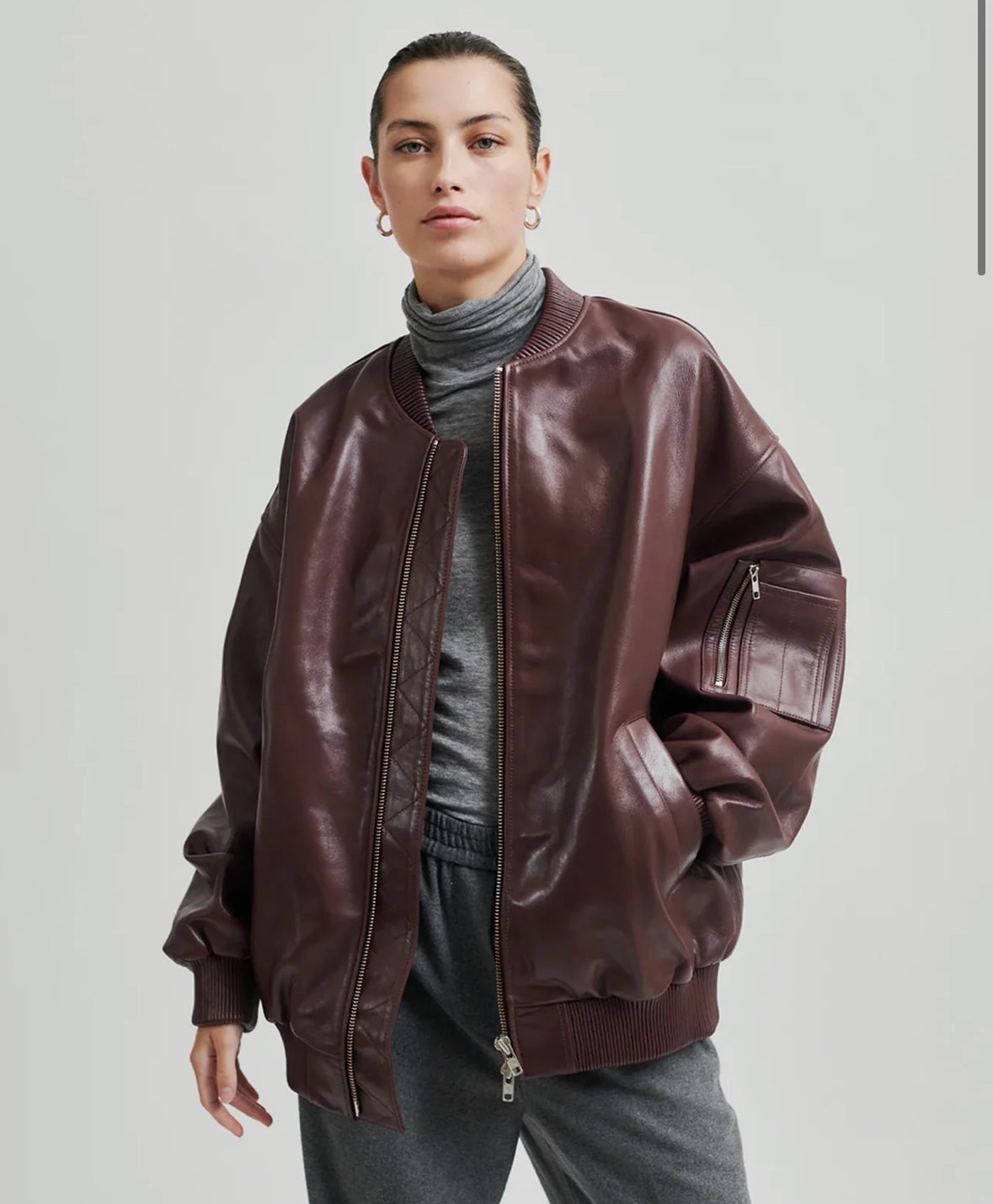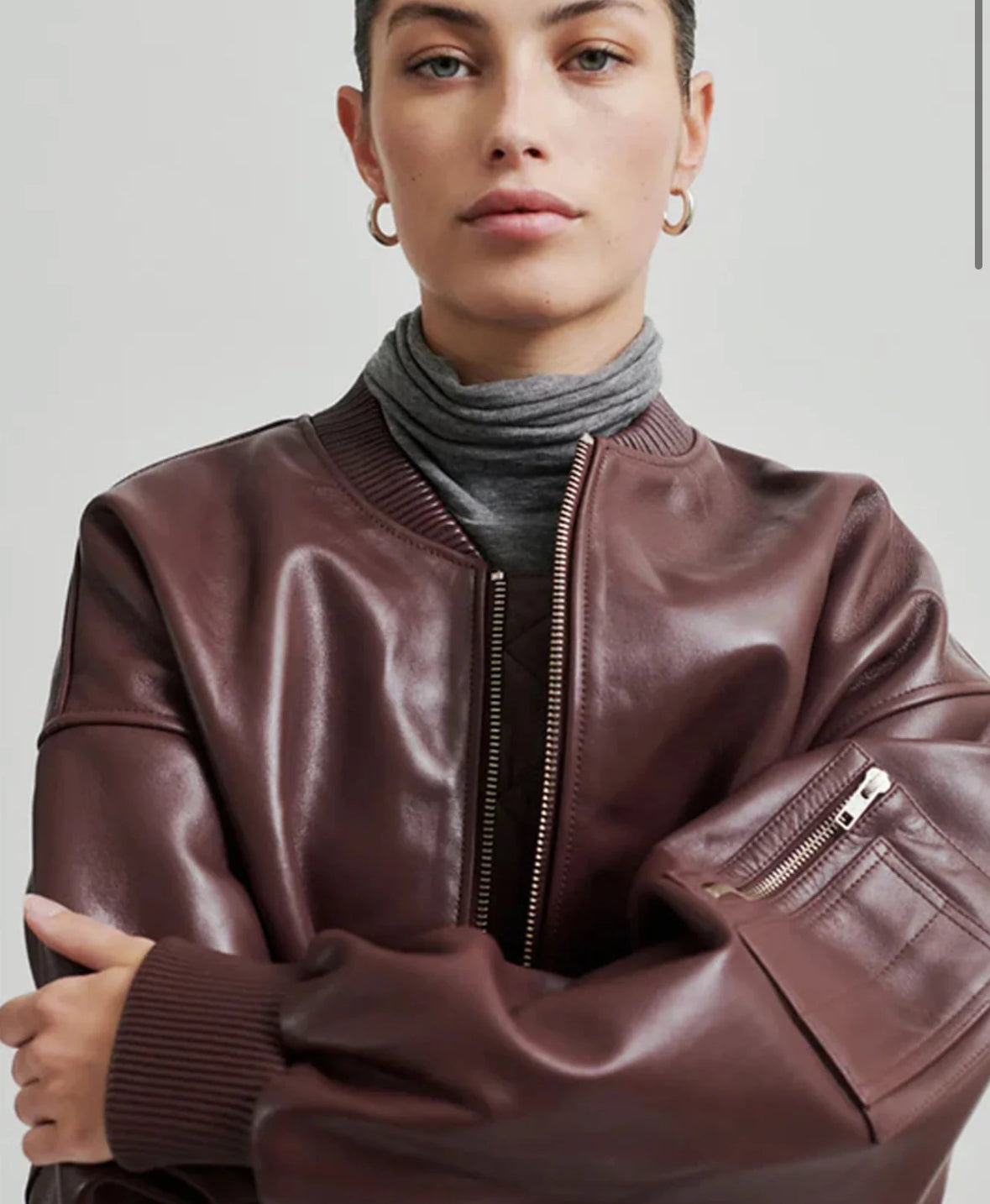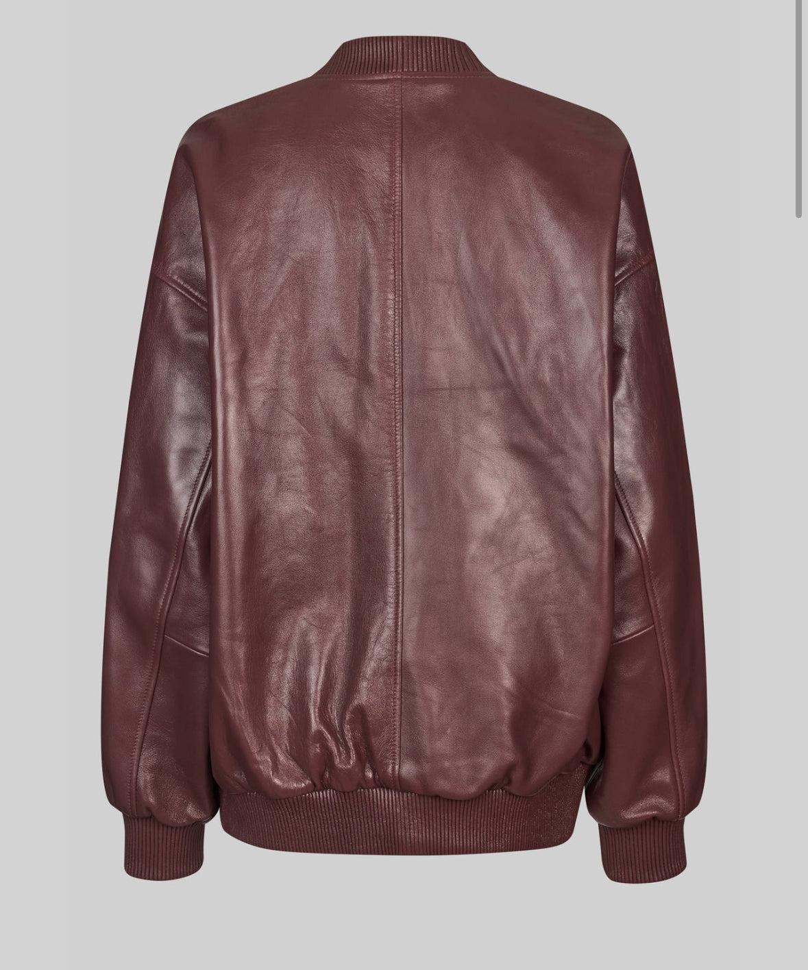 Übergroße Lederjacke von Second Female. Die Jacke ist aus weichem, glattem Leder gefertigt. Mit großem Kragen und durchgehendem Metallreißverschluss. Zwei große Pattentaschen und zwei Schultergurte mit Druckknopfverschluss. Überschnittene Schultern und lange Ärmel mit Reißverschlüssen an den Bündchen. Elastischer Saum hinten. Leicht übergroße Passform für entspannten Tragekomfort.