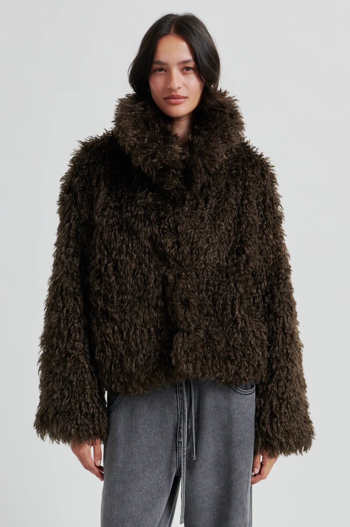 Shaggy-Jacke von Second Female. Die Jacke ist aus ultraweichem Stoff mit zotteliger, schafähnlicher Textur gefertigt. Mit verdecktem Haken- und Ösenverschluss vorne und zwei verdeckten Taschen. Vollständig gefüttert. Normale Passform mit entspannter, leicht kastiger Silhouette.