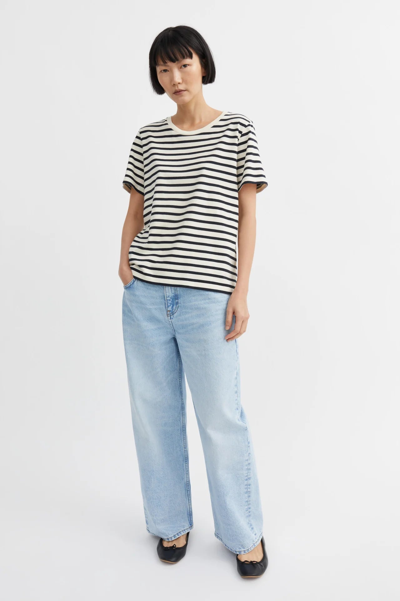 Das Loui Regular Tee ist ein bequemes, schweres Baumwoll-T-Shirt im Breton-Stil. Es hat eine lockere Passform und einen weiten Rundhalsausschnitt mit Rippbündchen.