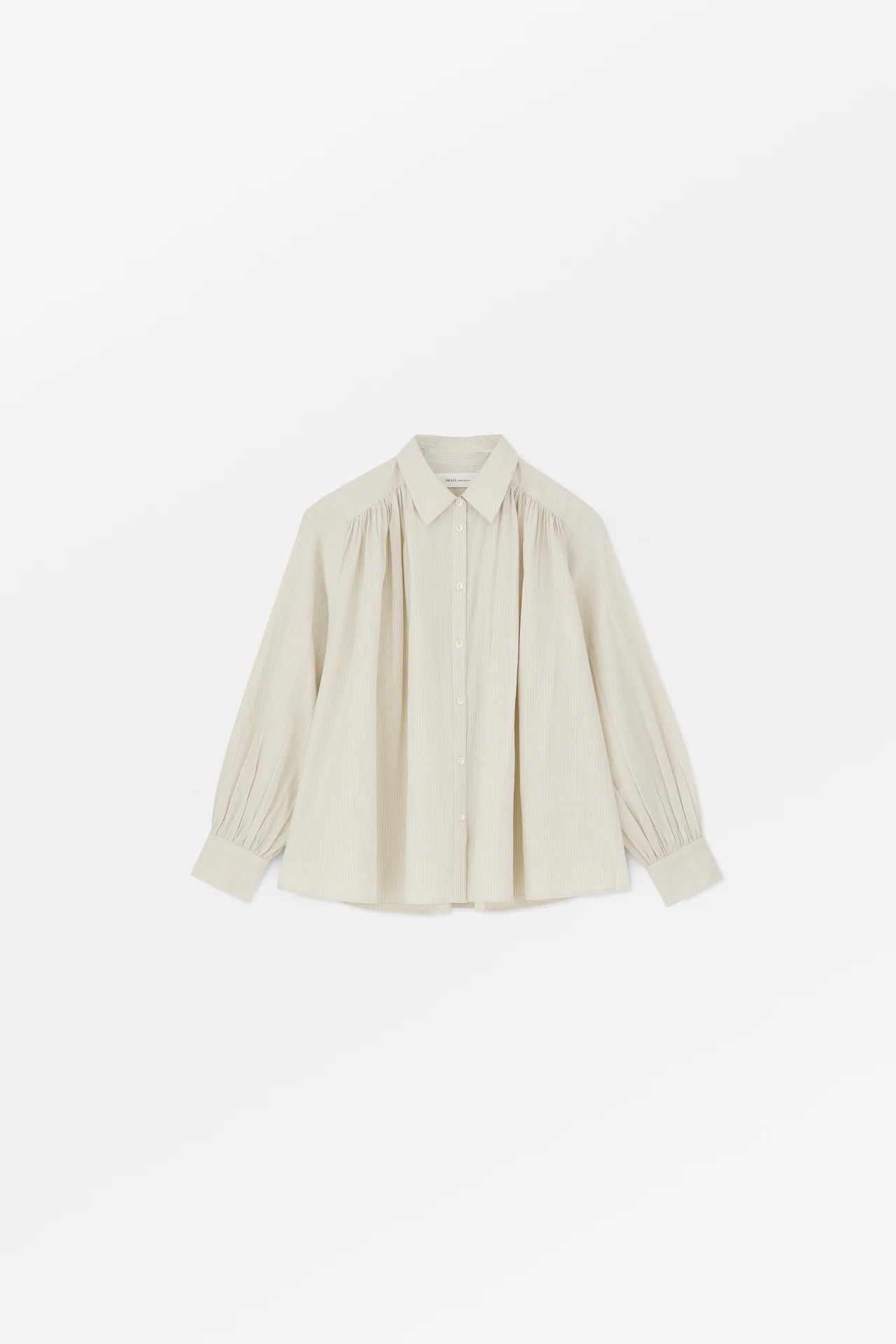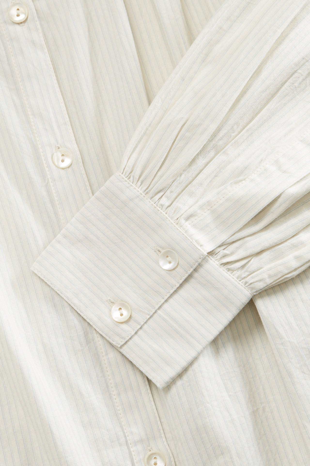 Ein leger geschnittenes Hemd aus leichter Bio-Baumwolle mit Perlmuttknöpfen vorne. Der Schnitt ist im Schulterbereich gerafft, der hinten eine markante V-Form aufweist. Die Ärmel enden in einer eleganten Knopfmanschette.