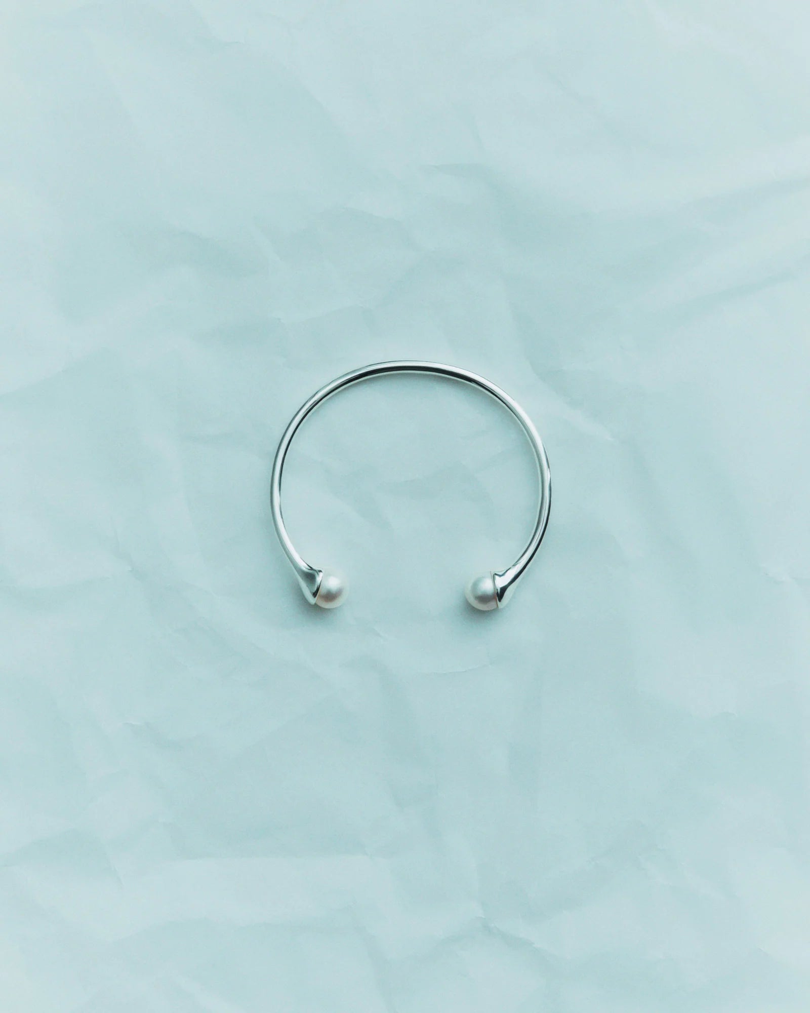Das Lumora-Armband aus 925er Sterlingsilber schmiegt sich elegant um das Handgelenk und wird von zwei zarten Süßwasserperlen gekrönt. Ein klares, skulpturales Schmuckstück, das Stärke und Sanftheit in einem raffinierten Design vereint.