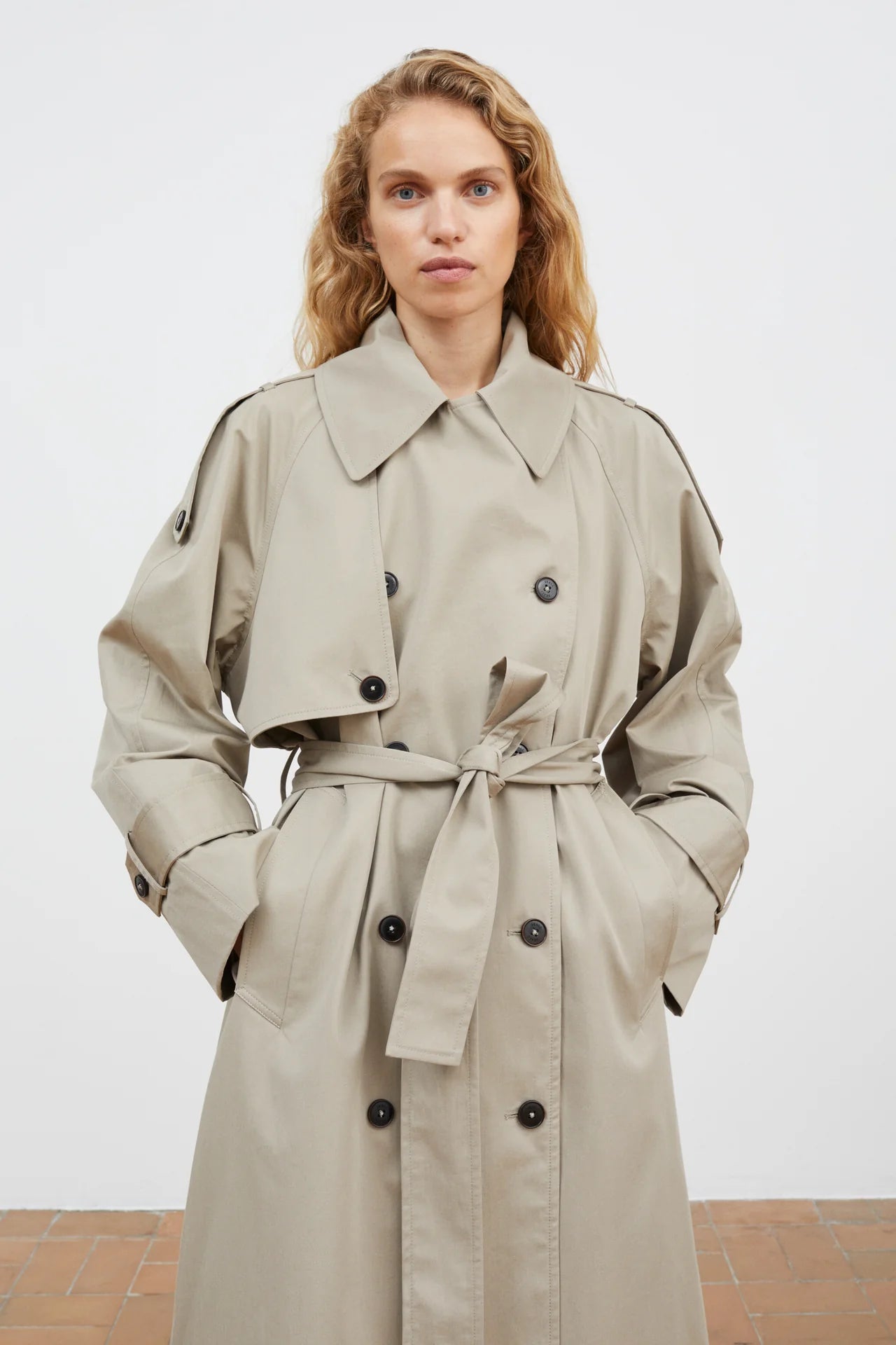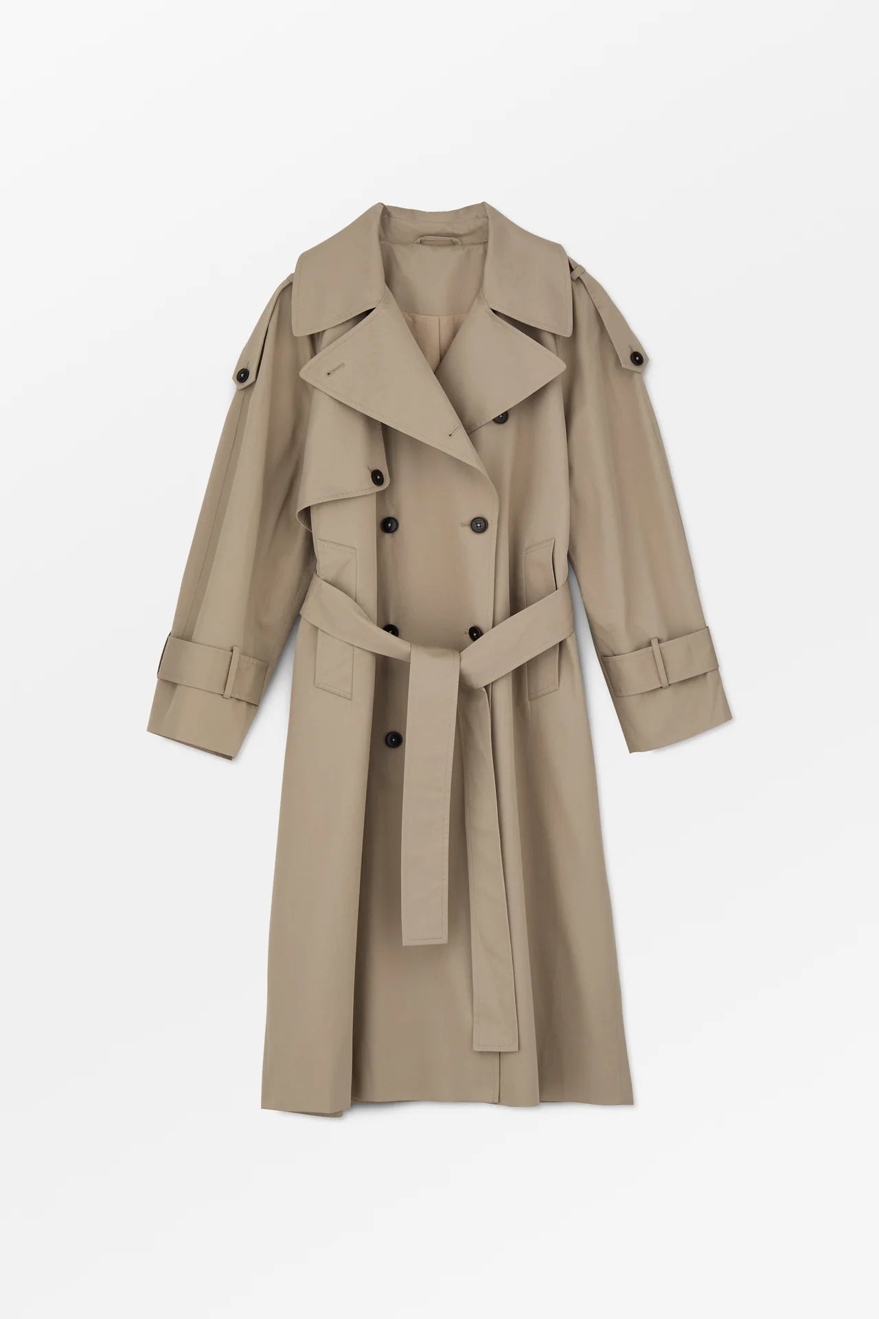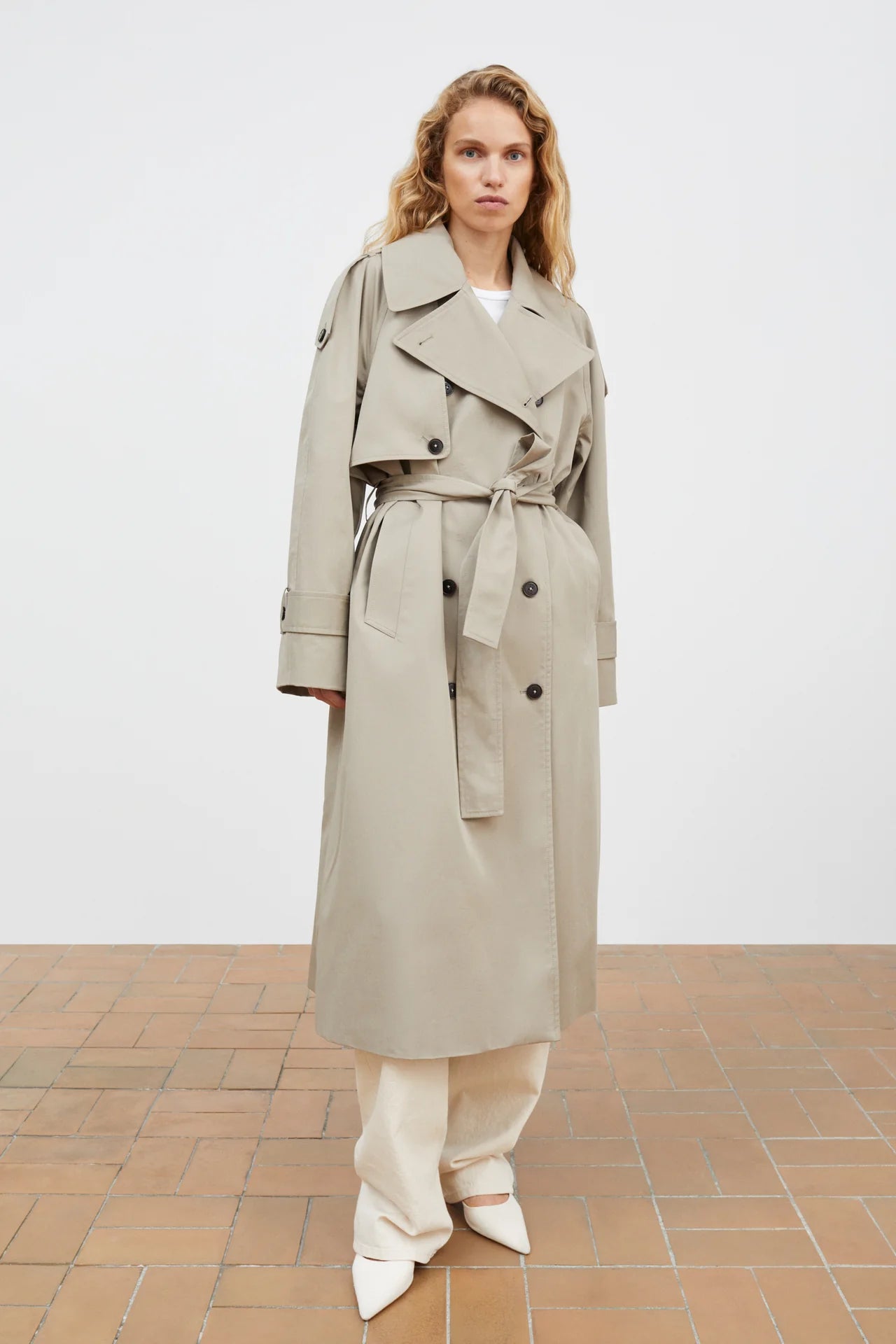 Ein klassischer Trenchcoat mit sehr großer Passform aus 100 % Bio-Baumwolle. Er hat eine zweireihige Vorderseite mit Verschluss am Hals, einen passenden Stoffgürtel zum Binden und eine Sturmklappe an Rücken und Schulter. Lange geknöpfte Schulterdetails und Gürtelverschlüsse an den Manschetten runden das Design ab.