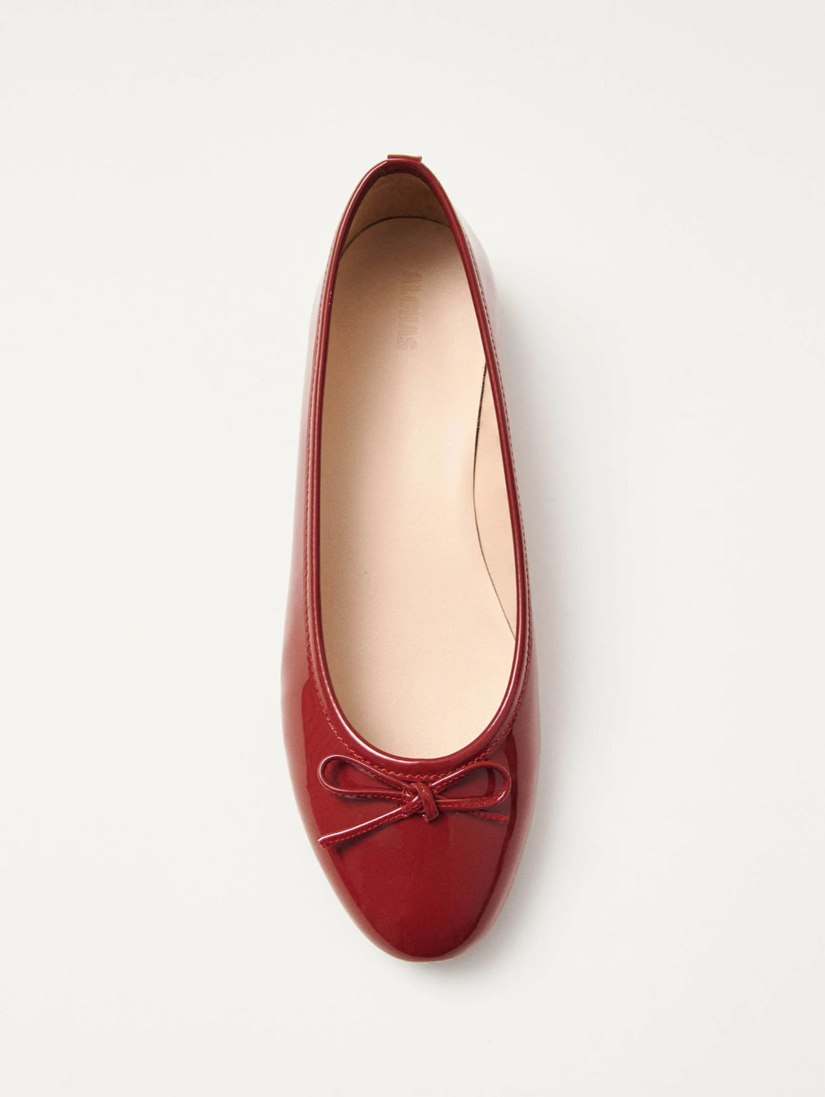 Die Oriana sind klassische Ballerinas. Sie sind aus rotem Leder gefertigt und haben eine Slip-On-Silhouette. An der Oberkante sind sie mit einer Verzierung versehen und an der runden Spitze mit Schleifen verziert.