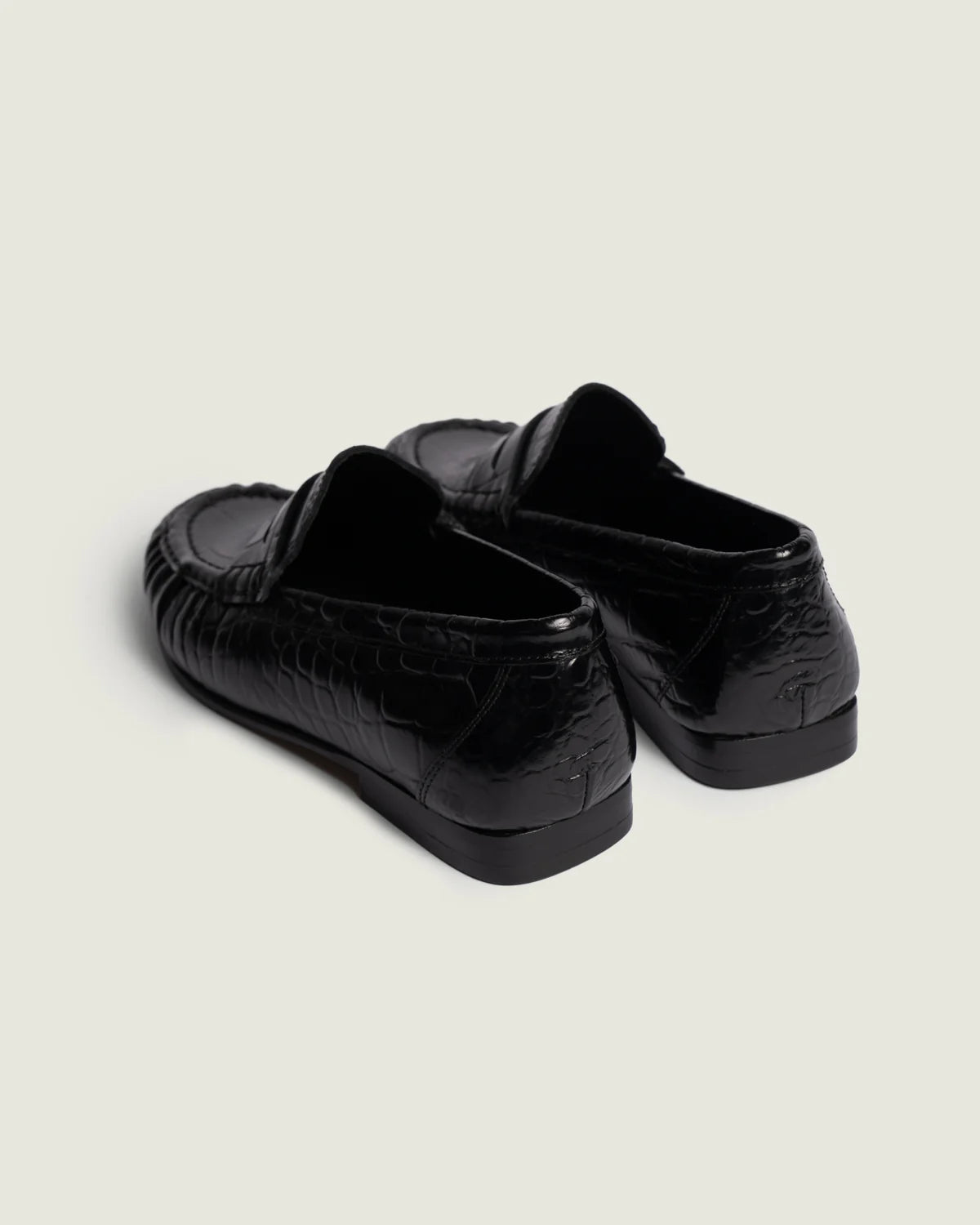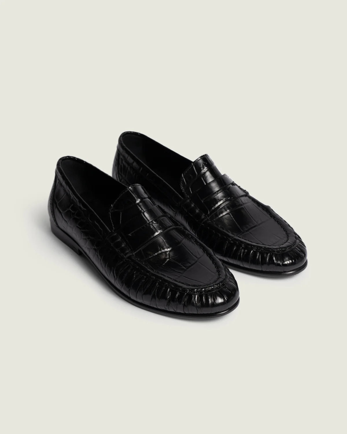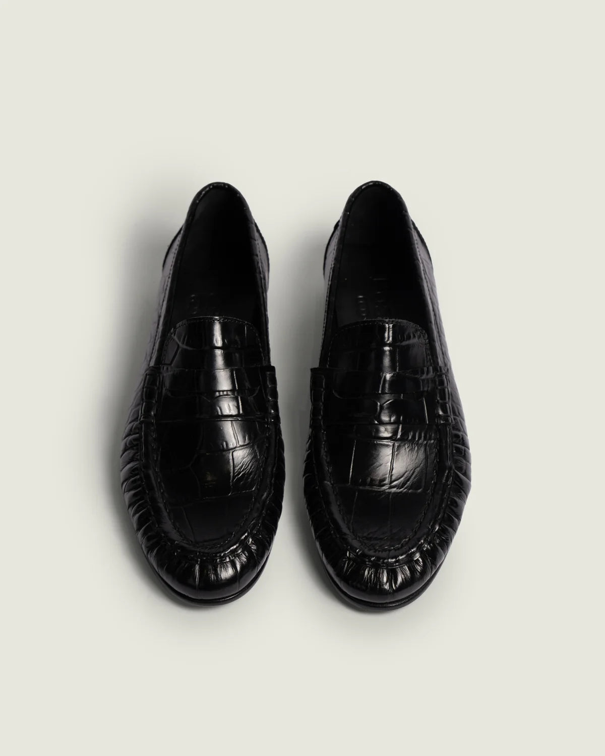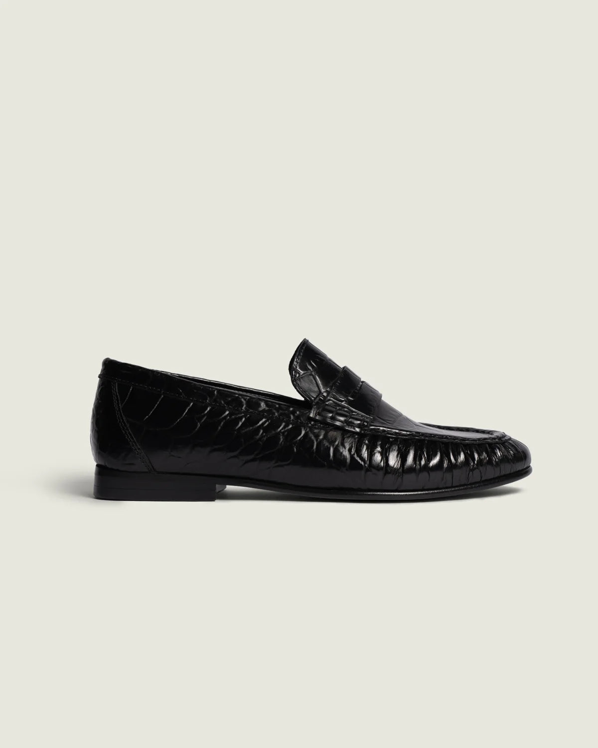 Der Posa Pennyloafer mit Falten aus Krokoleder, repräsentativ für die Posa-Tradition, zeugt von klassischer Eleganz. Mit seinen geschmeidigen italienischen Materialien und der raffinierten, schnittigen Silhouette ist dieser Schuh das ultimative Statement für Alltagseleganz.