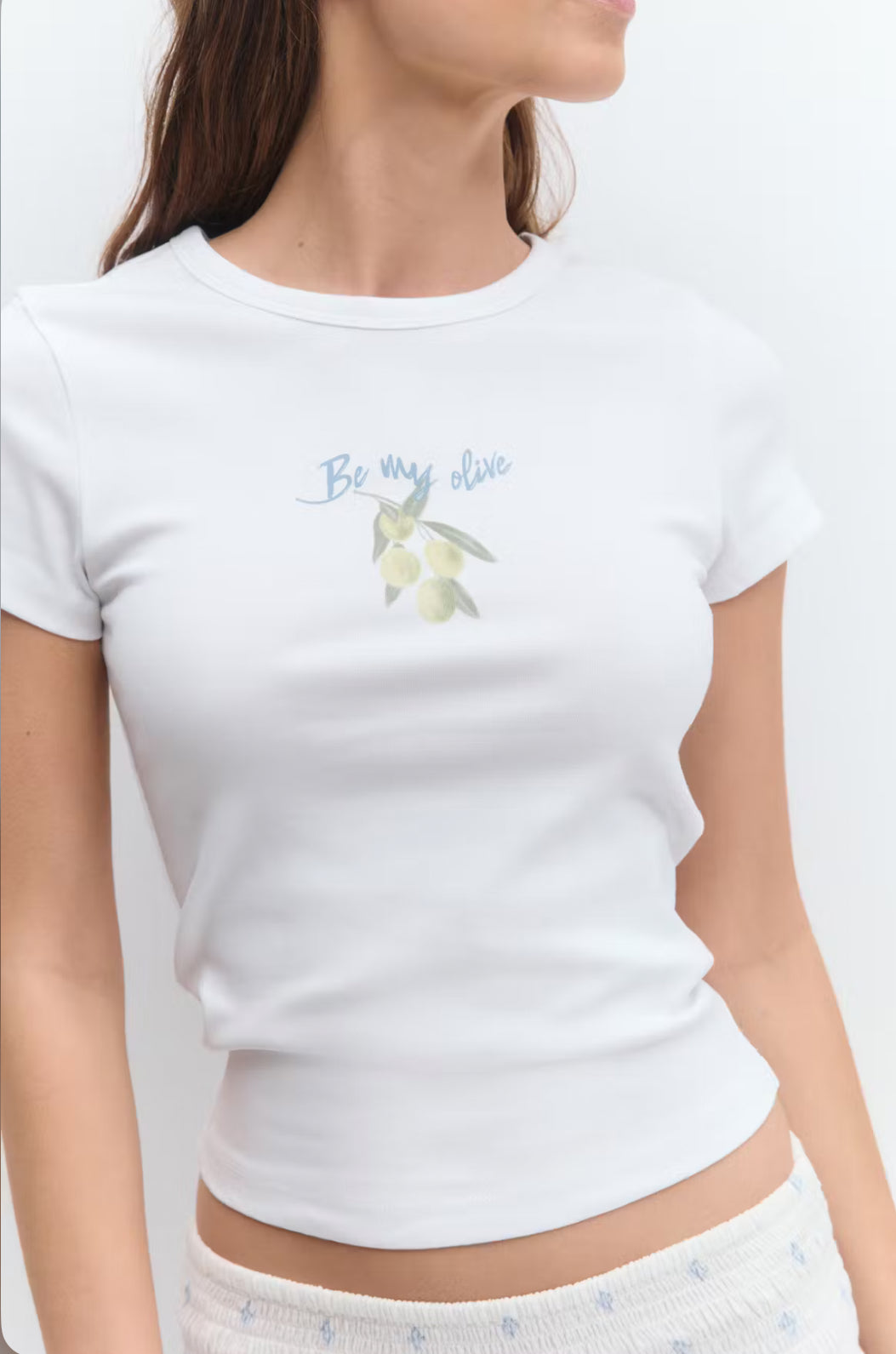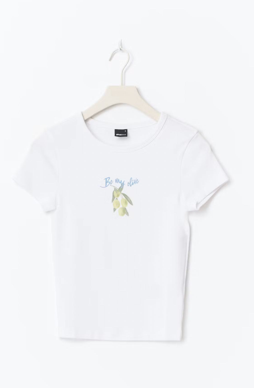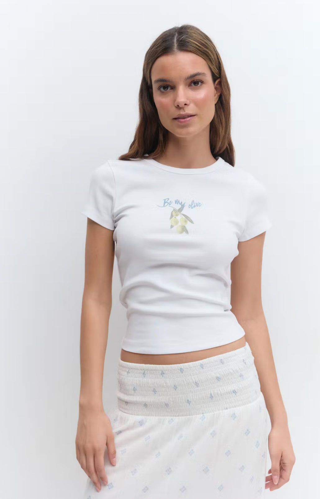 Kurzärmliges Top mit Print auf der Vorderseite. Das Top ist weiß und hat eine figurbetonte Passform. Es hat einen runden Ausschnitt und eine kurze Länge.