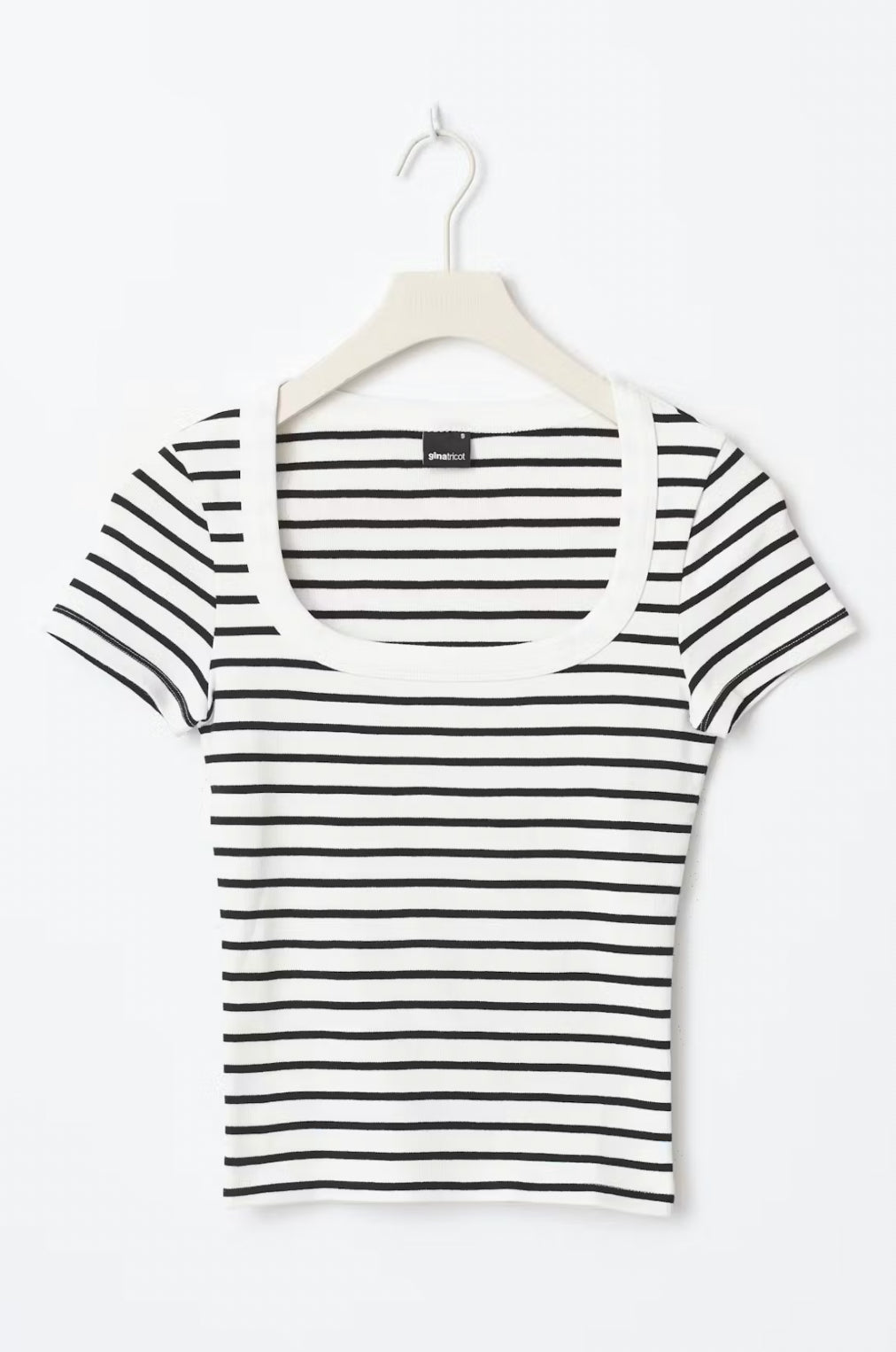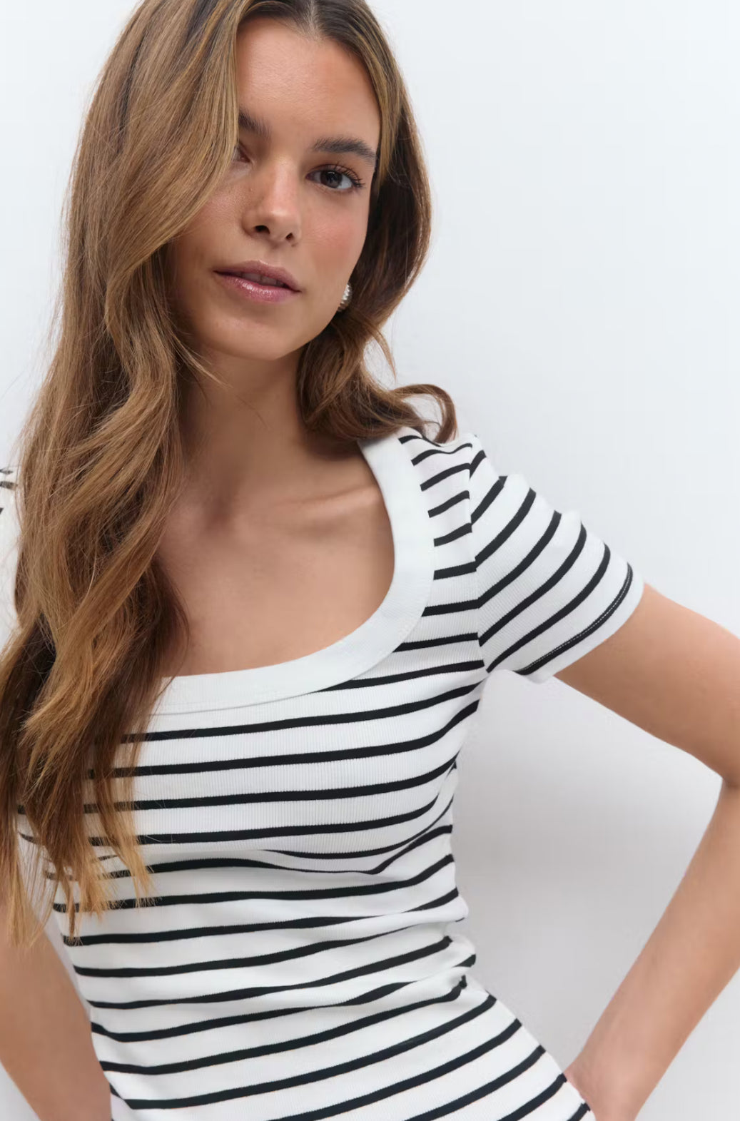 Gestreiftes Oberteil mit quadratischem Ausschnitt. Das Oberteil ist schwarz und weiß und kurzärmlig und hat ein geripptes Material. Es hat figurbetonte Passform und abgeschnittene Länge.