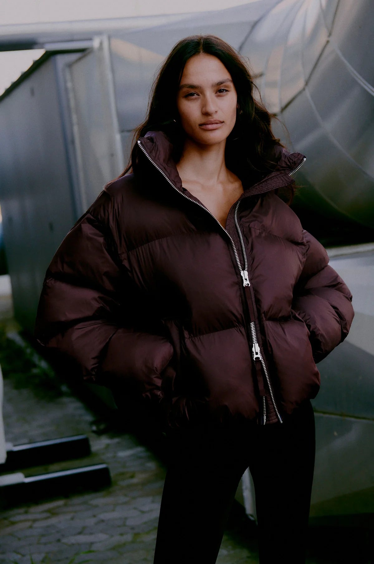 Kurze Pufferjacke von Second Female. Hergestellt aus weichem, glattem Stoff mit farblich abgestimmten Steppnähten und großzügiger Wattierung. Ausgestattet mit einem Zwei-Wege-Reißverschluss aus Metall mit Schieber. Zwei Seitentaschen und lange Ärmel mit elastischen Bündchen. Elastischer Saum. Kurze Passform mit bauschiger Silhouette
