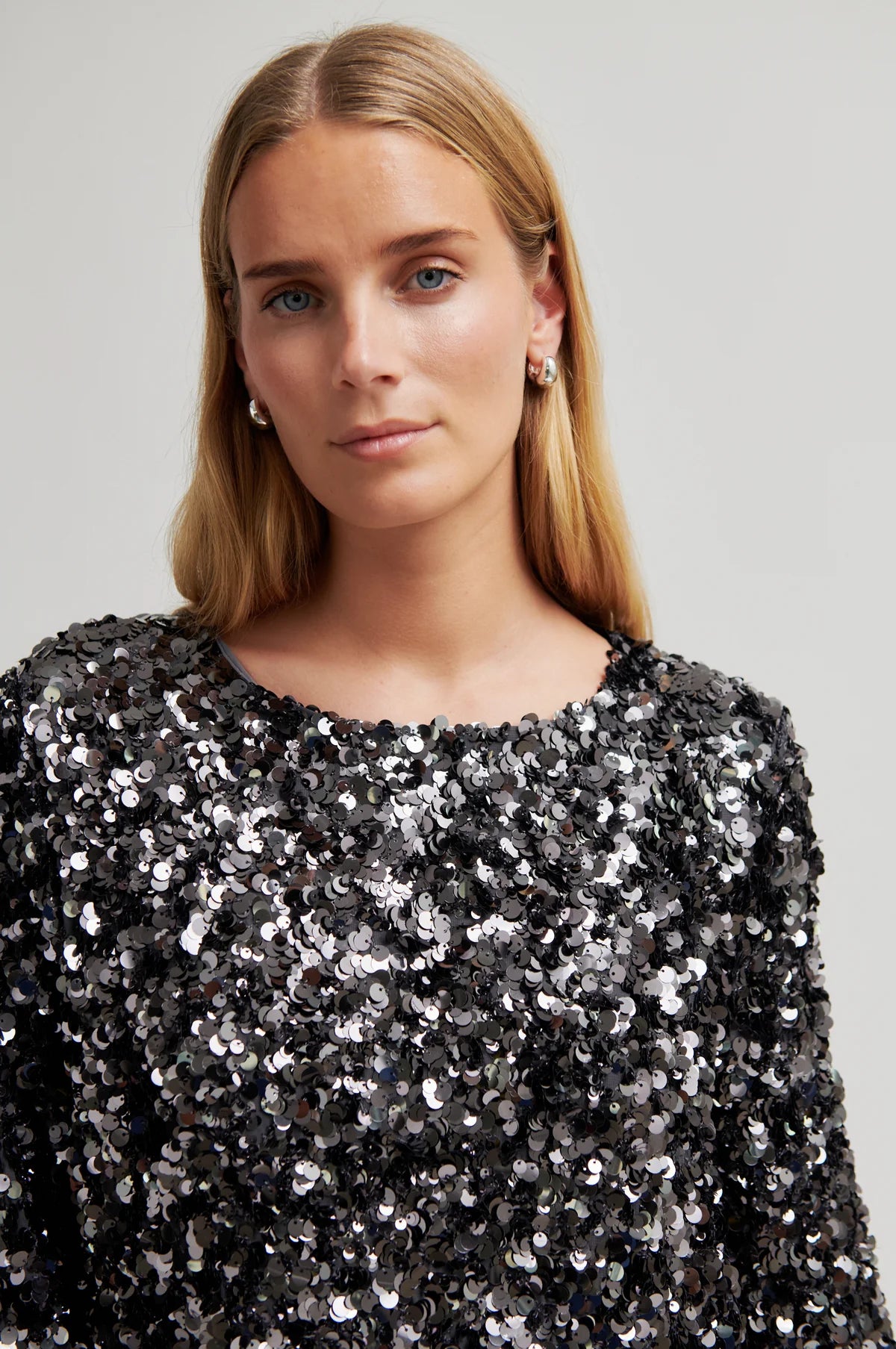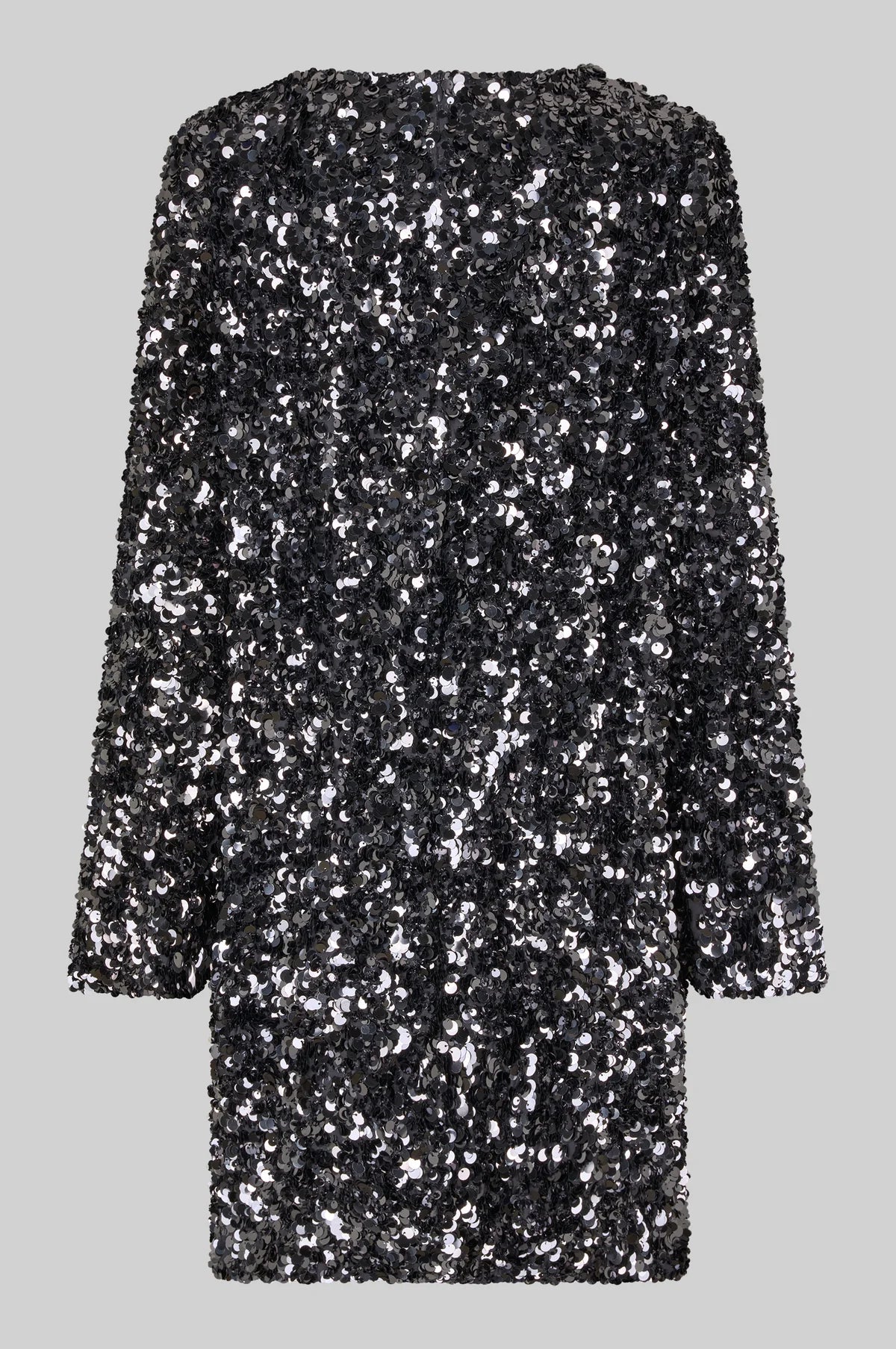 Paillettenkleid für Damen (Second Female). Das Kleid kombiniert funkelnde Pailletten und transparenten 3D-Stoff auf einem farblich abgestimmten Netzstoff. Es hat einen hohen Kragen und einen Reißverschluss im Rücken. Die Vorderseite ist mit einer Raffnaht versehen. Schulterpolster und lange Ärmel runden das Design ab. Das Kleid ist gefüttert und hat eine figurbetonte Passform.