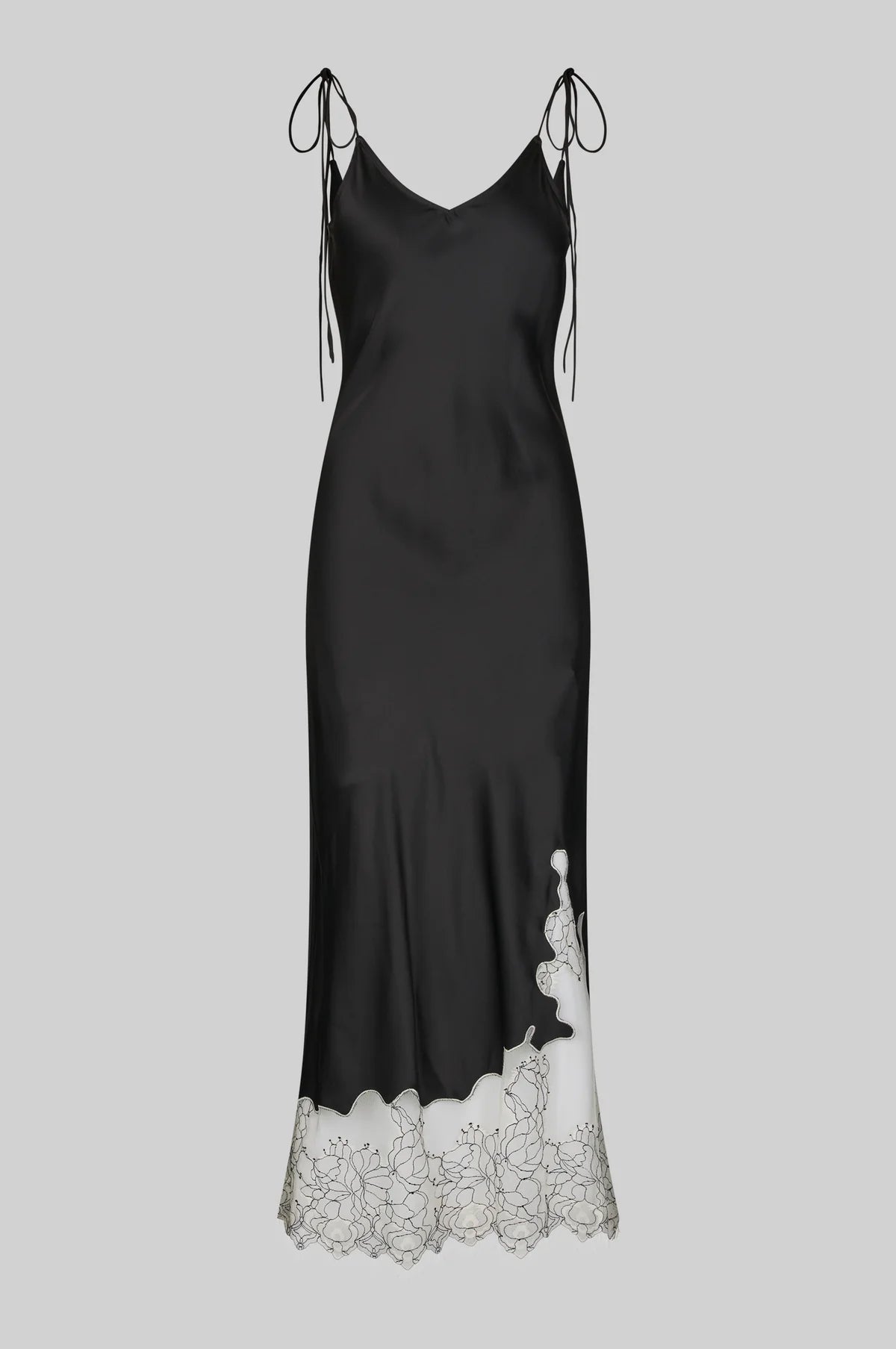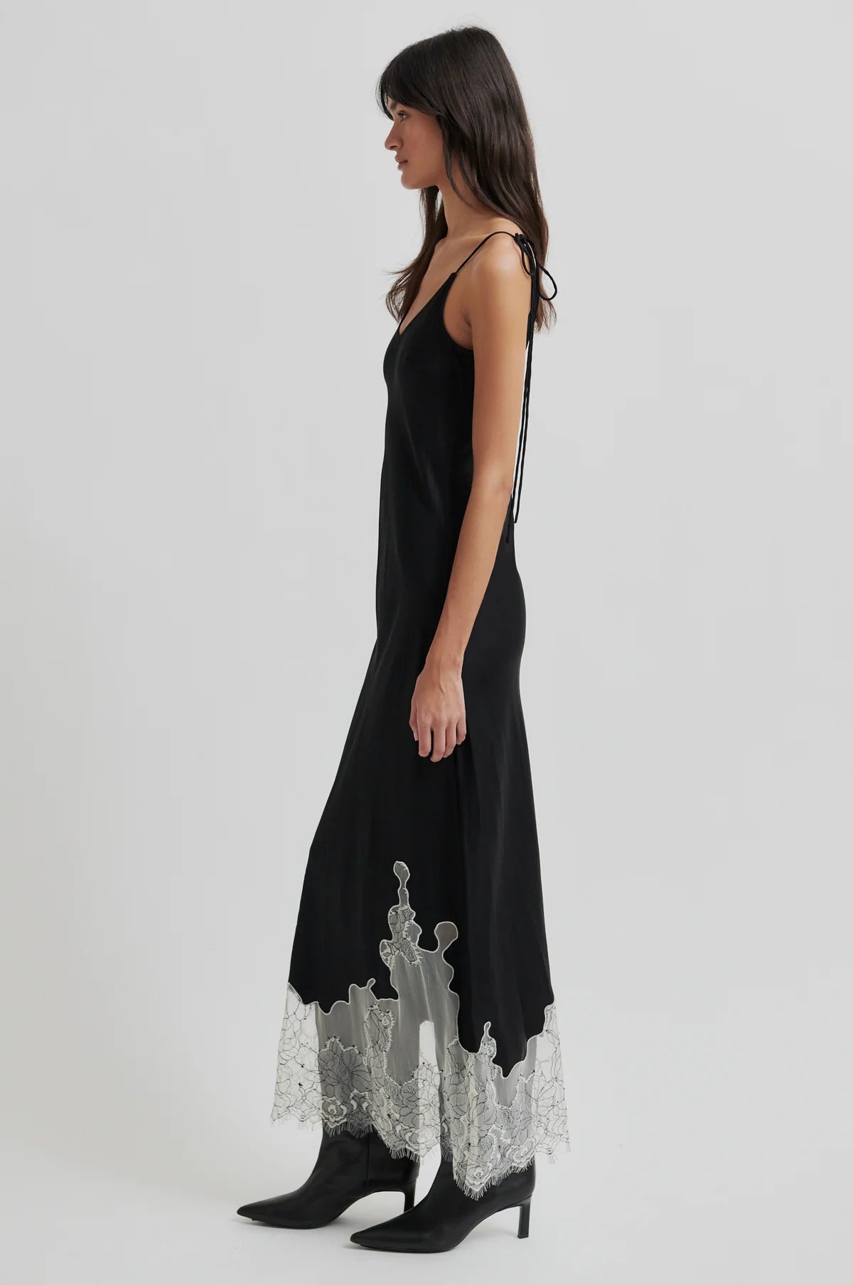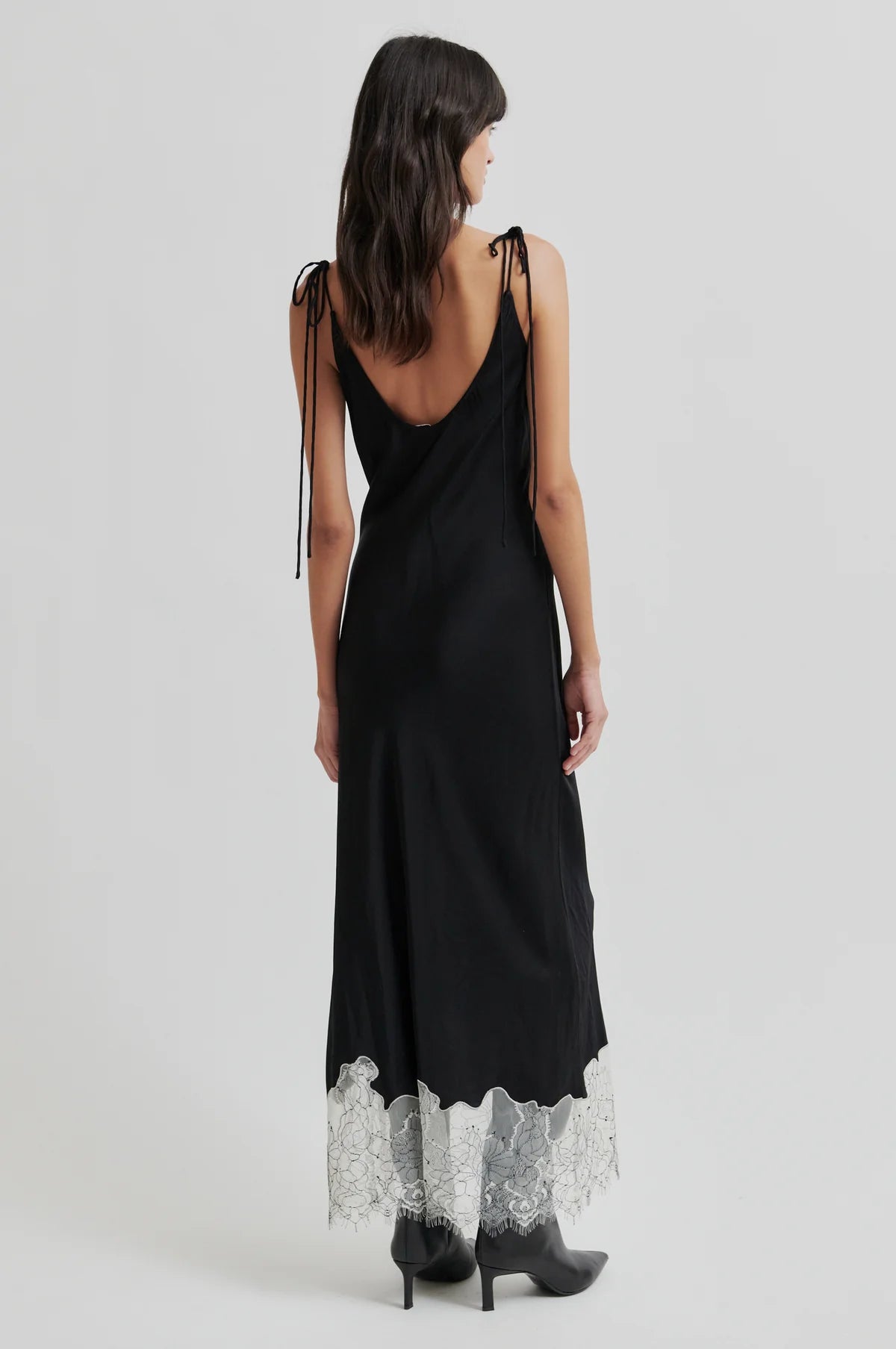 Maxikleid mit Spitze von Second Female. Das Kleid besteht aus einer seidig-weichen Viskosemischung mit fließender Qualität. Mit tiefem V-Ausschnitt und schmalen Trägern zum Binden. Transparenter Spitzenbesatz am Saum mit gewellter Kante. Schmale Passform mit langer, schlanker Silhouette.
